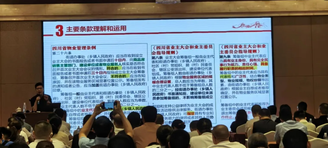 当天,在培训会上,四川省住房和城乡建设厅专家、《四川省物业管理条例》起草组主要成员伍三明从法规条例入手,配合大量实操案例进行讲解。讲解中,培训人员不仅学习了解了新条例的法律知识,还结合案例掌握了运用到实际工作中的方法与技巧。