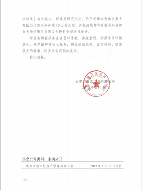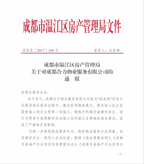【监管通报】成都市温江区房产管理局关于对成都合力物业服务有限公司的通报