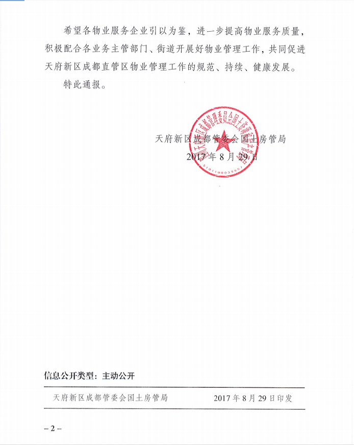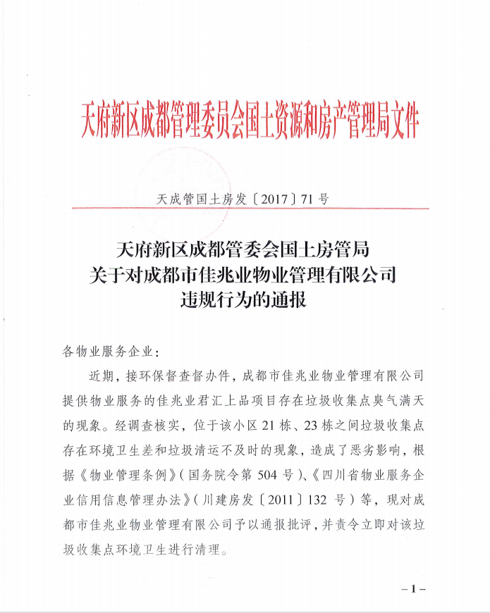 【监管通报】天府新区成都管委会国土房管局关于对成都市佳兆业物业管理有限公司违规行为的通报