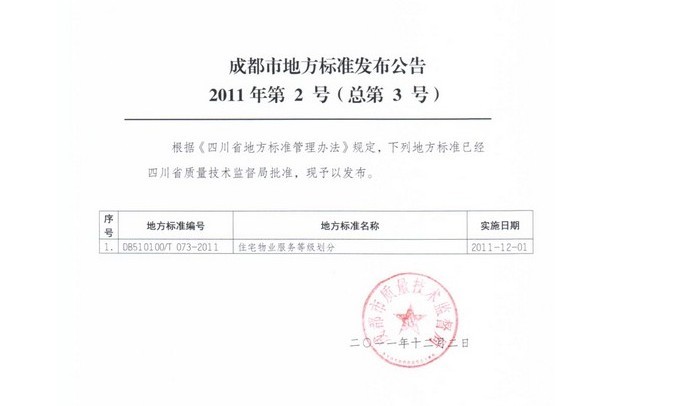 【规范性文件】四川省区域性地方标准《住宅物业服务等级划分》(DB510100T 073-2011)