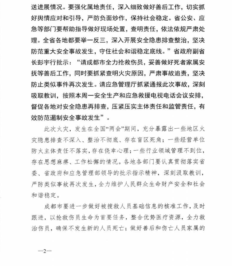 3月6日19时31分,成都市武侯区佳灵路53号一汽配仓库发生火灾,过火面积约600平方米,初步判断火灾为2楼汽配仓库引发。此次火灾造成4人死亡、24人受伤(2人急危重、4人重伤、18人轻伤)。据了解,该建筑为钢混结构,共9层,其中一楼为二手车门市,2楼为汽配仓库,3楼以上为居民住宅。目前伤员已全部送往医院救治,相关工作正有序开展,事故调查正在进行。为深刻汲取此次事故教训,根据《四川省安全生产委员会办公室关于成都市武侯区一汽配仓库火灾情况的通报》(川安办〔2019〕24号)。