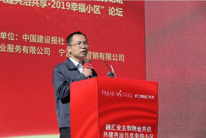 发布会上,中国建设报社社长王胜军发表开幕致辞。他指出,目前,我国城镇化水平接近60%,8亿多居民生活在城市,建设幸福小区事关民生福祉,是一项系统工程。他表示,幸福小区的建设需要多方协同,党建是统领,共识是关键,服务是基础,这三个方面共同指向的目标就是美好幸福生活。物业服务具有服务对象多、服务内容多、服务时间长的特点,作为物业服务企业,应当从居民需求出发,提升服务品质,积极建设幸福小区。