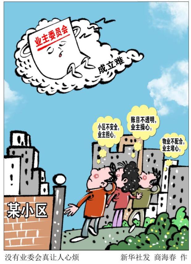 新华社图表,漫画:没有业委会真让人心烦 根据物权法等相关法律规定,成立业委会是业主保障“主人翁”地位、维护自身合法权益的重要途径。然而,新华社记者近日了解到,在南昌市红谷滩新区红角洲片区,涉及10万余名业主的20多个小区,多年来无一处建立业委会。 业主委员会缺席对业主生活会造成何种影响?谁该为业委会无法成立负责?新华社记者对此展开调查。 新华社发 商海春 作