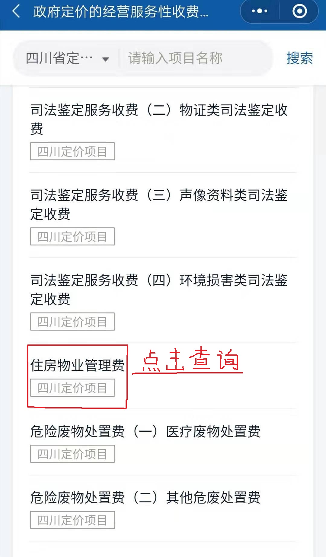四川省住房物业服务费(四川定价项目)详细情况查询,具体可在文中“政府定价的经营服务性收费查询”系统国务院客户端小程序查询。