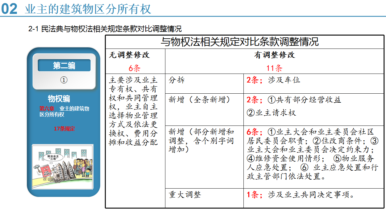 《民法典》涉及物业管理相关规定,奠定了物业管理的民事法律基础。2021年1月1日民法典将正式实施,与之前实行的相关法律、法规有所改变,主要体现在:业主的建筑物区分所有权的改变、侵权责任的改变、物业服务合同的改变等等,这些都给物业管理行业带来一定的冲击,其中投票表决规则、公共收益、高空抛物等热点问题,更是跟物业公司的利益息息相关。